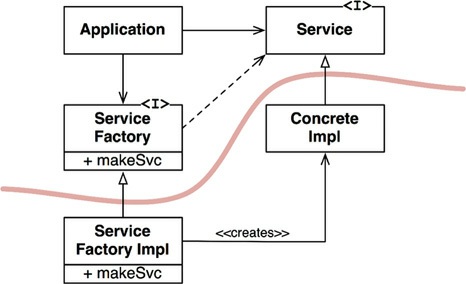 Application➡️ 依賴 ➡️ServiceFactory(介面) - 結果: 原始碼的依賴與控制流程反向。這邊界將系統切為兩半:抽象層(高層)與具體層(低層)
