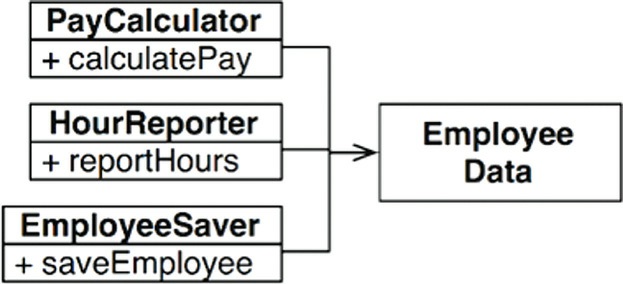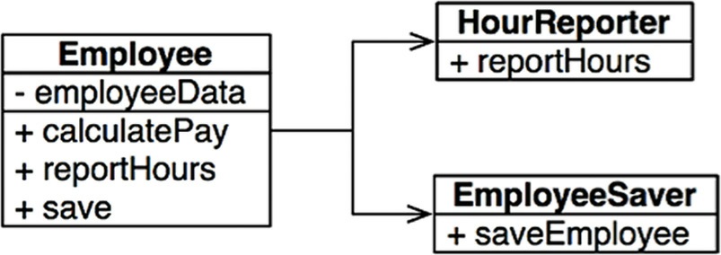 PayCalculator、HourReporter、EmployeeSaver - 這些類別只包含各自所需原始碼,互不認識,避免意外重複