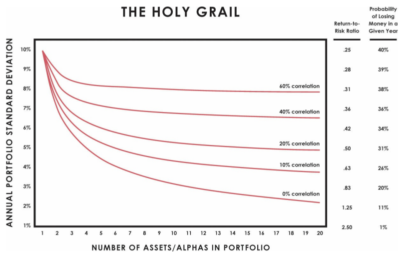 聖杯的真義: 透過持有互不相關(Uncorrelated)的資產,可以在不降低預期報酬的情況下,大幅降低風險。這讓投資者能在有限的風險額度內,追求最大的收益。