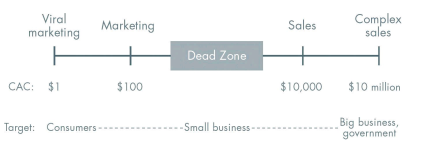 | 死亡地帶 | 中間價位(如 $1,000) | 價格不夠高無法支撐業務員成本, 又不夠大眾化無法靠電視廣告。 許多新創失敗於此 |