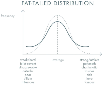 - 真實的創業家分布: 他們呈現一種 「反常態分布」(倒鐘形或雙峰分布)。可能同時是局外人又是局內人;既是無賴又是英雄;極度天真又極度精明。