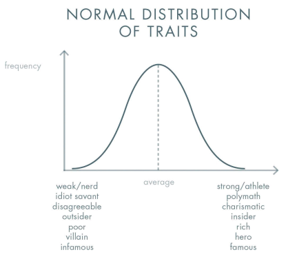 大部分的人都集中在中間平均值,極端的人(無論極度愚笨或聰明、極度討人厭或迷人)都佔極少數。